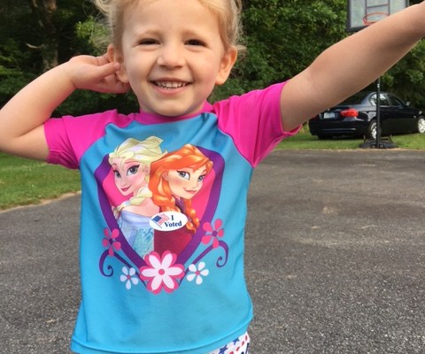 This morning on the way to work and school, PKB and I stopped off to vote in the Virginia primary election. It was PKB’s first voting experience, so naturally, I had to take a picture outside with her wearing the ‘I voted’ sticker.